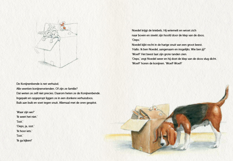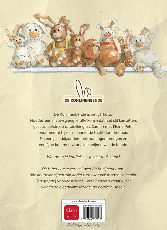 In het kinderboek 'Noedel krijgt de kriebels' is de Konijnenbende verhuisd! Noedel, een nieuwsgierig knuffelkonijn dat geen seconde stil kan zitten, besluit meteen op ontdekkingstocht te gaan. Samen met Kleine Peter dwaalt hij door het nieuwe huis, waar ze bijzondere ontmoetingen beleven en een fijne buit verzamelen voor alle konijnen van de bende.