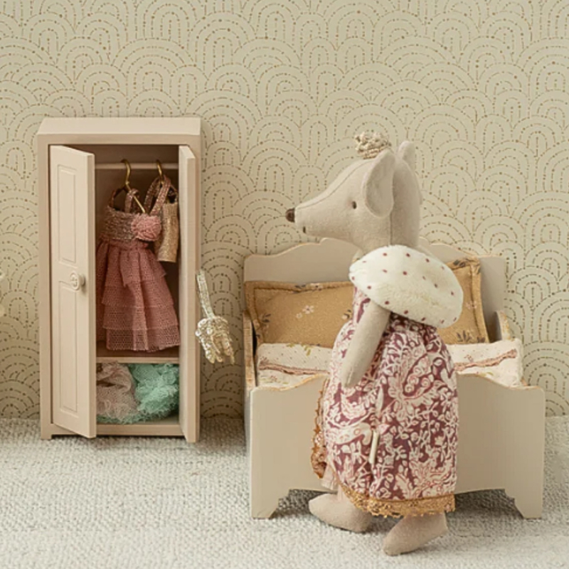 Moeder muis koningin draagt een prachtige koninklijke outfit, ontworpen in de herkenbare, liefdevolle Maileg-stijl. Haar elegante jurk en zachte bontkraag geven haar een vorstelijke uitstraling, terwijl het gouden kroontje op haar hoofd laat zien dat zij écht de koningin van het muizenrijk is.
