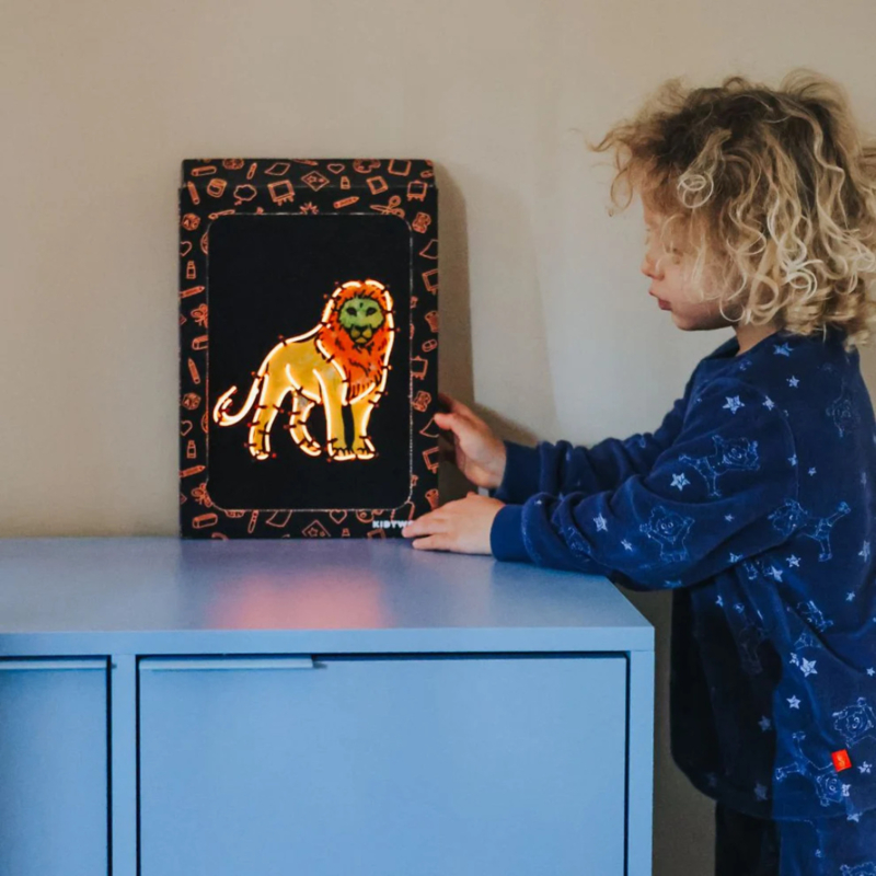 Eerst geven ze de dieren kleur met de 6 meegeleverde stiften, daarna komt het magische deel: het neonoranje draad. Dit soepele neondraad volg je eenvoudig langs de vormen van het dier en klik je moeiteloos vast in het bord. Stap voor stap groeit het ontwerp uit tot een cool, lichtgevend kunstwerk. Klaar? Dan maak je van de doos in een handomdraai een lijst om het kunstwerk trots neer te zetten.