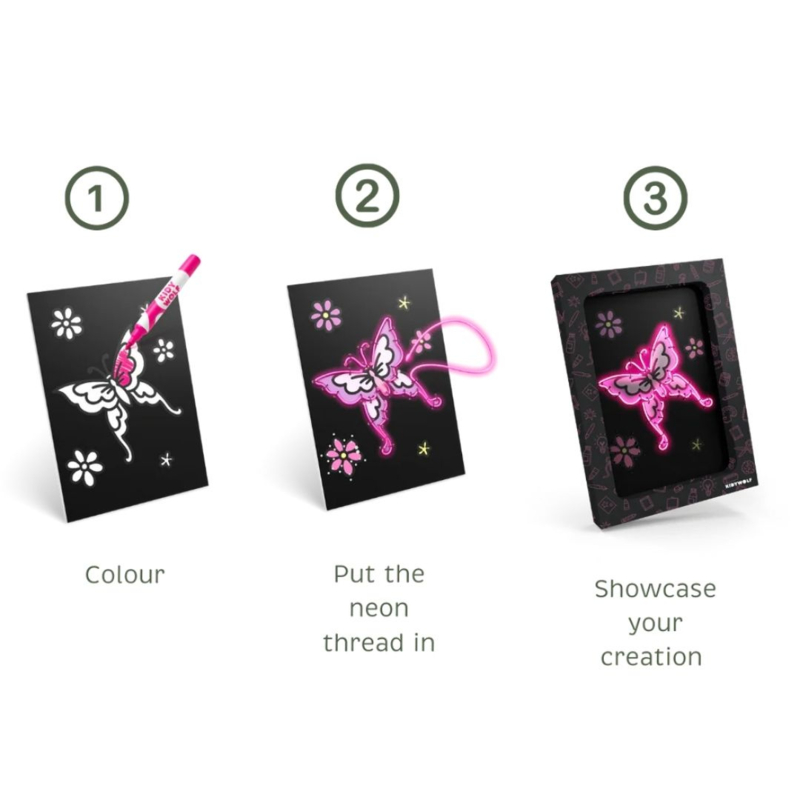 Eerst geven ze de sprookjes kleur met de 6 meegeleverde stiften, daarna komt het magische deel: het neonrozedraad. Dit soepele neondraad volg je eenvoudig langs de vormen van het sprookje en klik je moeiteloos vast in het bord. Stap voor stap groeit het ontwerp uit tot een cool, lichtgevend kunstwerk. Klaar? Dan maak je van de doos in een handomdraai een lijst om het kunstwerk trots neer te zetten.