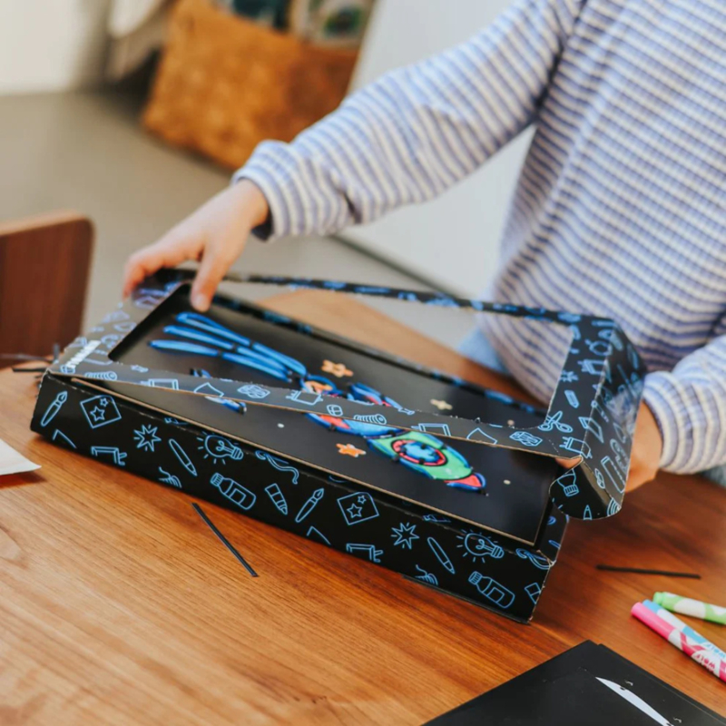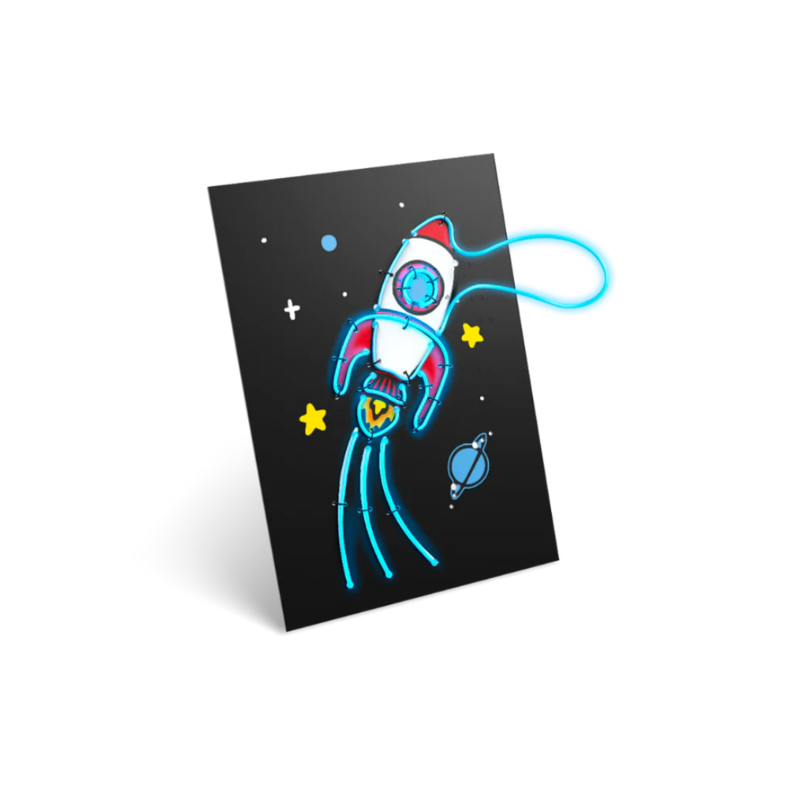 Eerst geven ze de afbeeldingen op de borden kleur met de 96meegeleverde stiften, daarna komt het magische deel: het neon draad. Dit soepele neondraad volg je eenvoudig langs de vormen van de afbeelding en klik je moeiteloos vast in het bord. Stap voor stap groeit het ontwerp uit tot een cool, lichtgevend kunstwerk. Klaar? Dan maak je van de doos in een handomdraai een lijst om het kunstwerk trots neer te zetten.
