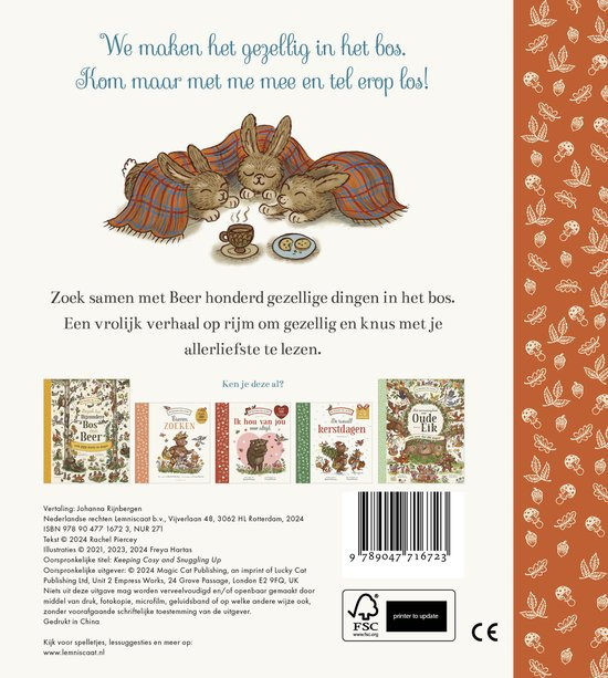 We maken het gezellig in het bos – tel je mee? Ga samen met Beer en zijn vrienden op ontdekking in het Bijzondere Bos. Op regenachtige middagen, koude winterdagen of gewoon wanneer je zin hebt in een knus momentje thuis, is dit stevige kartonboekje precies wat je zoekt.