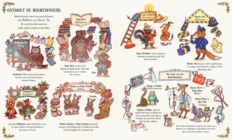 Ga mee naar de school, neem een kijkje bij de bakker en stap binnen bij de kruidenier. Onderweg kom je vertrouwde bosbewoners tegen, zoals Professor Uil, Mama Vos en Opa Pad. Iedereen draagt op zijn eigen manier bij aan het leven in het bos.