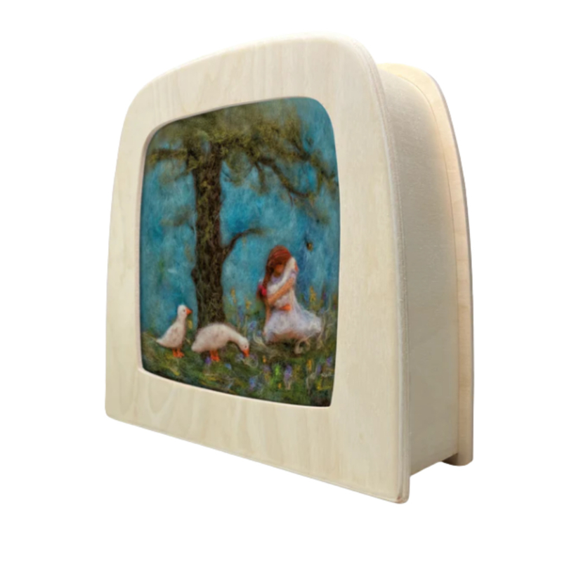 Deze lieve toverplaat met een meisje die een gans knuffelt is perfect voor de toverlamp en ideaal voor kinderen die dol zijn op dieren.