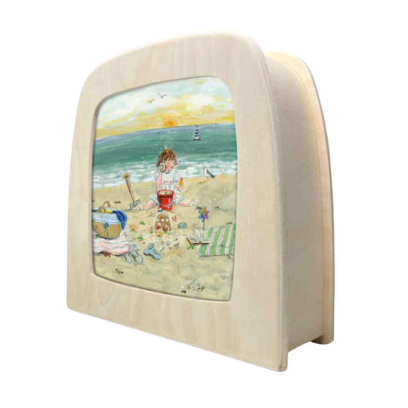 Deze vrolijke toverplaat met een illustratie van een kindje die heerlijk speelt op het strand is perfect voor de toverlamp en ideaal om in de zomer te gebruiken.