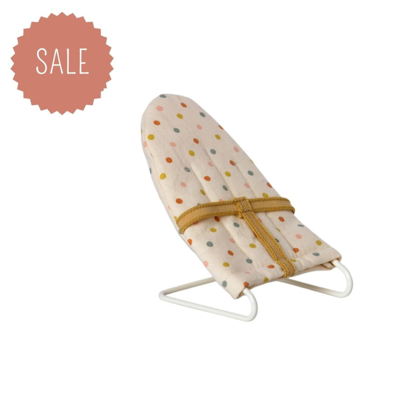 Met dit wipstoeltje van Maileg is het gemakkelijk om je kleine Maileg vriendjes in slaap te brengen. De basis is van metaal en bekleed met de mooiste stof met print van kleurrijke stipjes. Dit poppenhuis wipstoeltje is perfect voor de konijntjes (in formaat micro) en de muisjes.