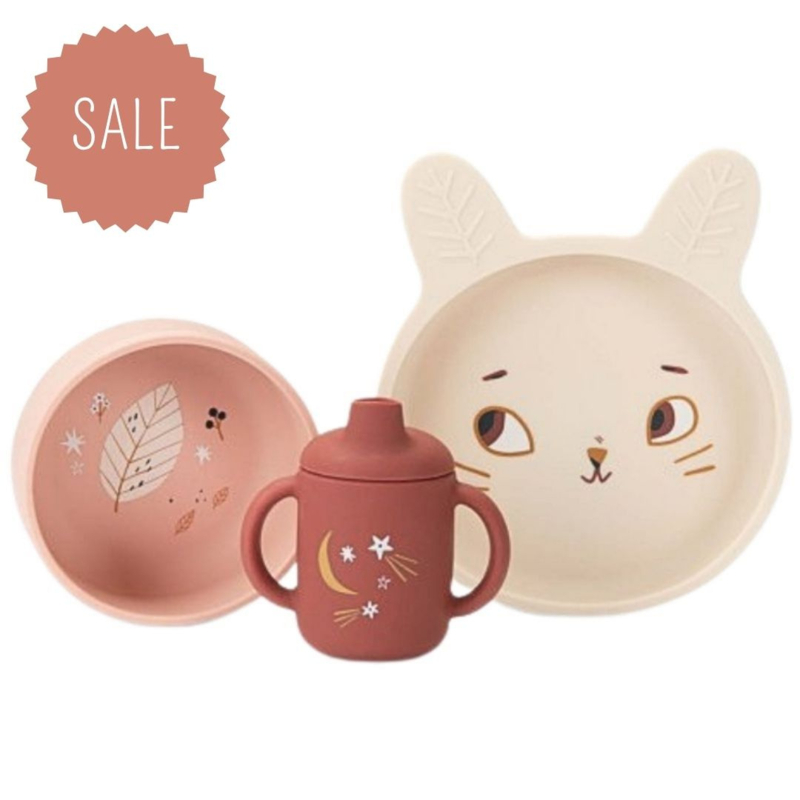 Dit mooie siliconen kinderservies komt uit de collectie Après la pluie van Moulin Roty. De eetset bevat een kommetje, een beker met handvatten en een bord. Het bord komt in de vorm van een konijnengezichtje en het kommetje en de beker zijn versierd met illustraties van blaadjes, sterretjes en de maan.