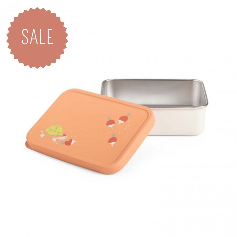 Het zachte siliconen deksel in een warme perzikkleur sluit goed af en is versierd met een lieve illustratie van een schildpad en speelse radijsjes. Extra leuk: combineer het snackdoosje met de bijpassende Trois Petits Lapins drinkbeker voor een complete set!