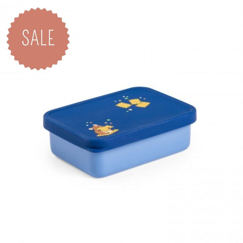 Het zachte siliconen deksel in een mooie blauwe kleur sluit goed af en is versierd met een lieve illustratie van hamster en koekjes. Extra leuk: combineer het snackdoosje met de bijpassende Puce & Pilou drinkbeker voor een complete set!